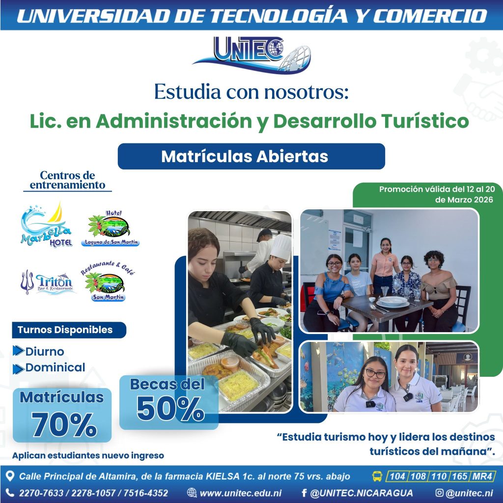 En la Universidad de Tecnología y Comercio (UNITEC) creemos en tus metas y en tu futuro. Si pausaste tus estudios, ¡reintégrate y continúa tu carrera! I Cuatrimestre 2026 Inicio de clases: El reto es seguir adelante. No dejes tus sueños en pausa. Para más información: WhatsApp: +505 8681-6481 / +505