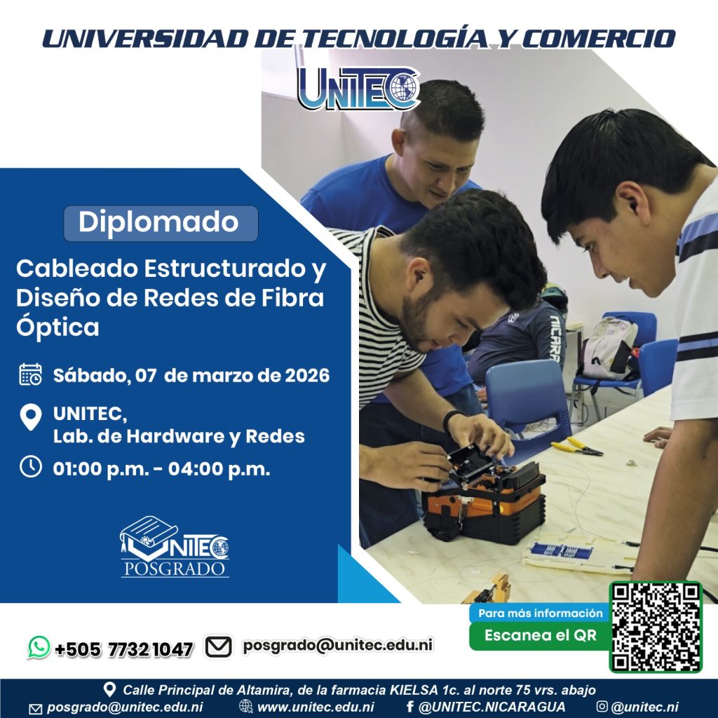 Diplomado en Cableado Estructurado y Diseño de Redes en Fibra Óptica ¿Estás listo para especializarte en una de las áreas con mayor crecimiento? En UNITEC te brindamos la formación técnica que necesitas para dominar el diseño e instalación de redes de fibra óptica. Lo que aprenderás Fecha de inicio: 7