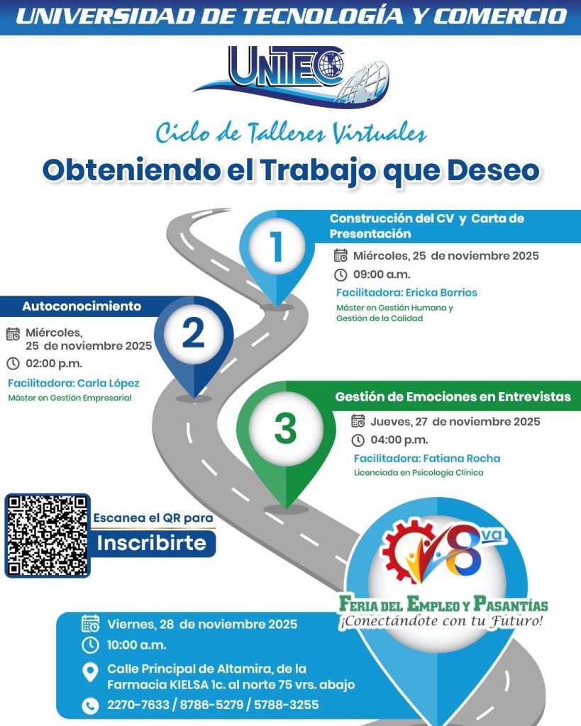¡Obtén el trabajo que deseas con nuestro Ciclo de Talleres Virtuales GRATUITOS! Antes de conectar con tu futuro en la Feria del Empleo y Pasantías, la Universidad de Tecnología y Comercio te invita a potenciar tus habilidades con estos talleres esenciales: Ciclo de Talleres Virtuales: ¡Regístrate ahora! Escanea el código QR en la imagen para […]