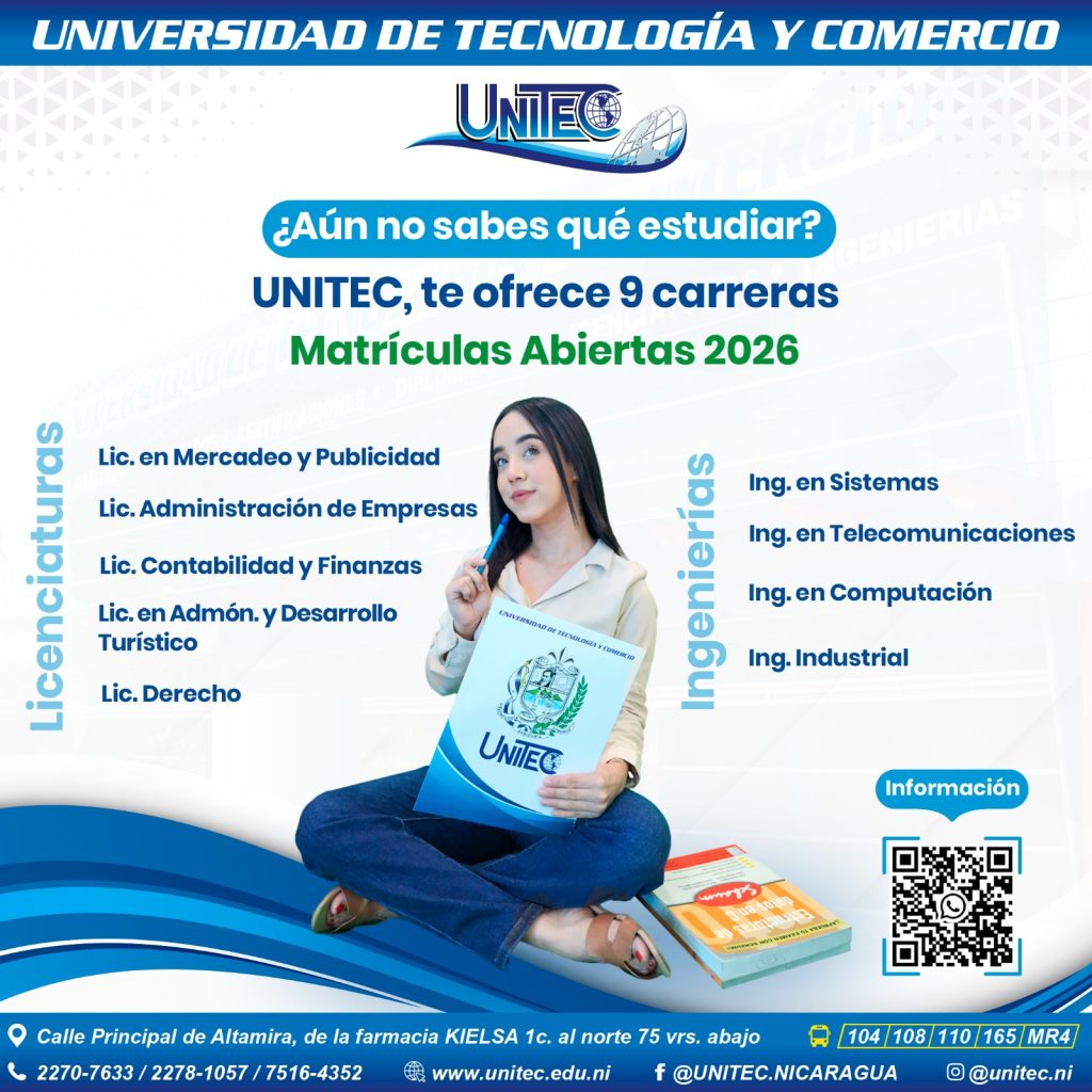 En UNITEC te abrimos las puertas a 9 oportunidades profesionales que transformarán tu vida. Licenciaturas: Ingenierías: Elige la carrera que conecte con tus sueños y conviértete en el profesional que siempre imaginaste. ¡Tu futuro comienza hoy! Teléfono: 2278-1057 WhatsApp: 5791-1516 / 7516-4352 Más información: www.unitec.edu.ni Correo: admisiones@unitec.edu.ni Matrículas Abiertas 2026