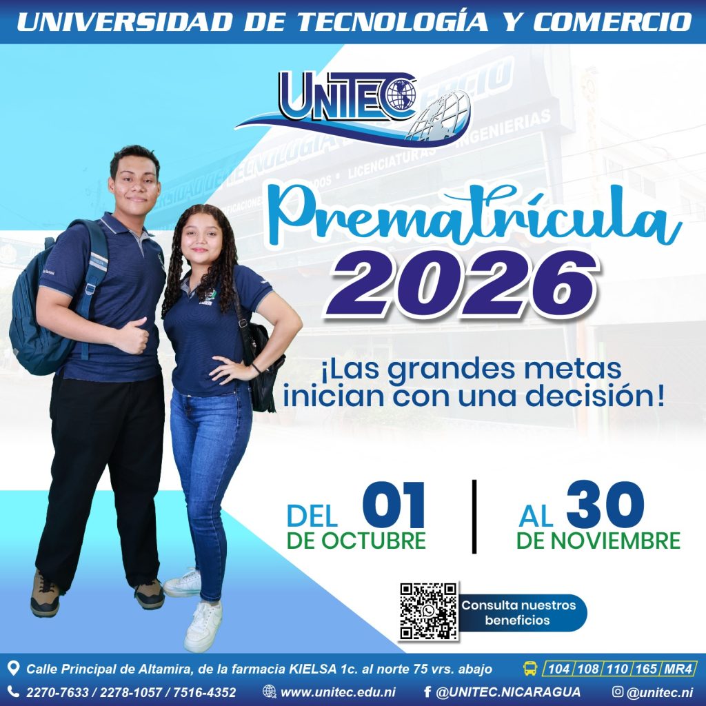 En UNITEC te abrimos las puertas a nueve oportunidades profesionales que transformarán tu vida. Licenciaturas: Ingenierías: Elige la carrera que conecte con tus sueños y conviértete en el profesional que siempre imaginaste. ¡Tu futuro comienza hoy! Teléfono: 2278-1057WhatsApp: 5791-1516 / 7516-4352Más información: www.unitec.edu.ni