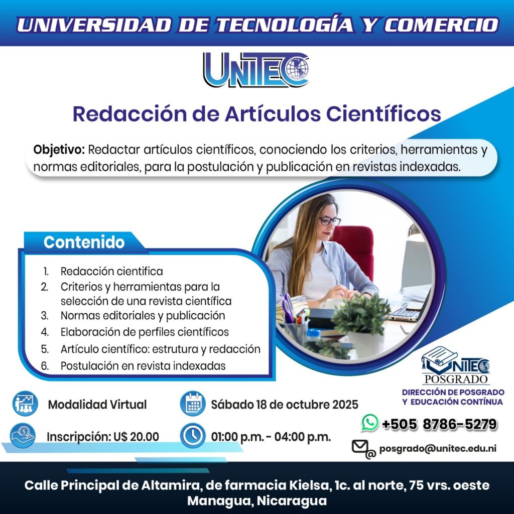 La Universidad de Tecnología y Comercio (UNITEC), a través de la Dirección de Posgrado y Educación continua, te invita a participar en la tercera edición del Taller de Redacción de Artículos Científicos. Durante el taller, adquirirás las herramientas y técnicas necesarias para estructurar, redactar y postular artículos con alta probabilidad de aceptación en revistas reconocidas […]