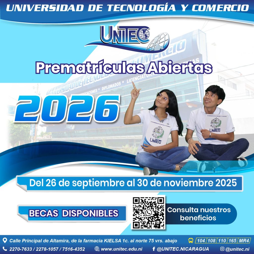 Prematrícula 2026 abierta en UNITEC Asegura tu cupo ahora mismo Elige entre 9 carreras universitarias Recibe asesoría personalizada Aprovecha descuentos exclusivos Pensado para ti, que buscas un futuro con propósito y una carrera que realmente te apasione. Más información por WhatsApp: 7516-4352 / 5791-1516