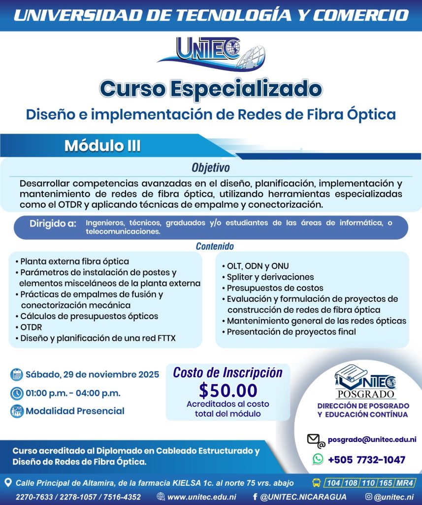 Módulo III – Diplomado en Cableado Estructurado y Diseño de Redes en Fibra Óptica ¿Trabajas en telecomunicaciones o eres estudiante del área? Este es el curso que te permitirá llevar tus conocimientos al siguiente nivel. Desarrollarás competencias avanzadas en el diseño, planificación, implementación y mantenimiento de redes de fibra óptica. Aprende a utilizar herramientas especializadas […]