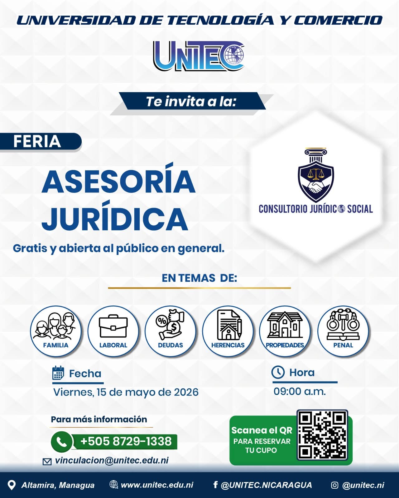 La Universidad de Tecnología y Comercio (UNITEC) y la Carrera de Licenciatura en Derecho, a través de su Consultorio Jurídico Social, te invitan a la Feria de Asesoría Jurídica.